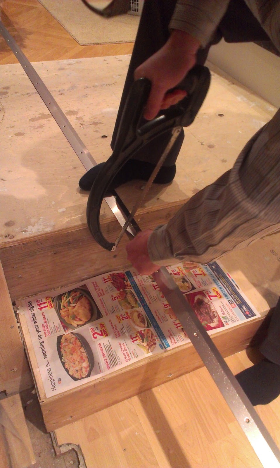 I needed to cut it to match the opening which was about 7.5 feet.  John suggested I use his “fancy, fancy hacksaw.”  His words.  Not mine.