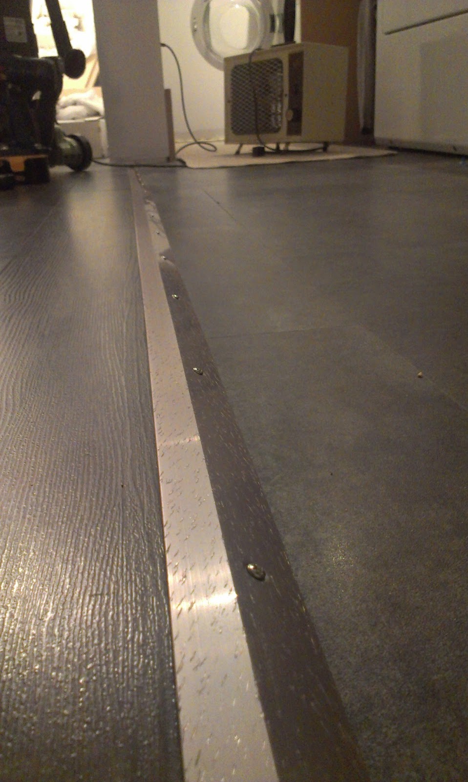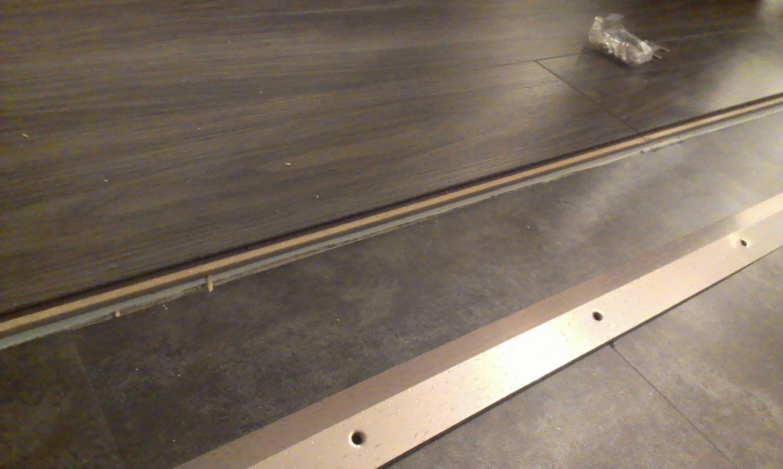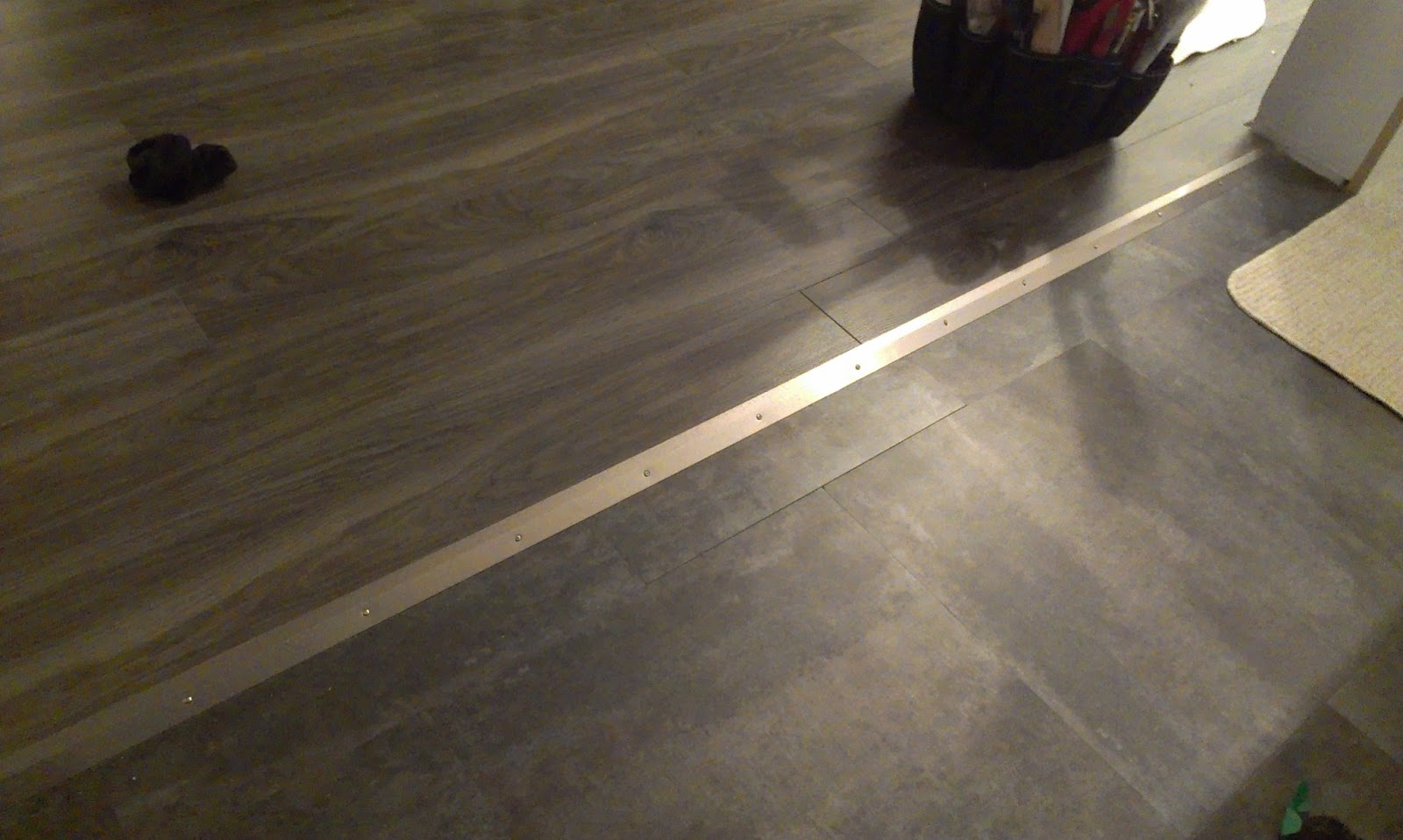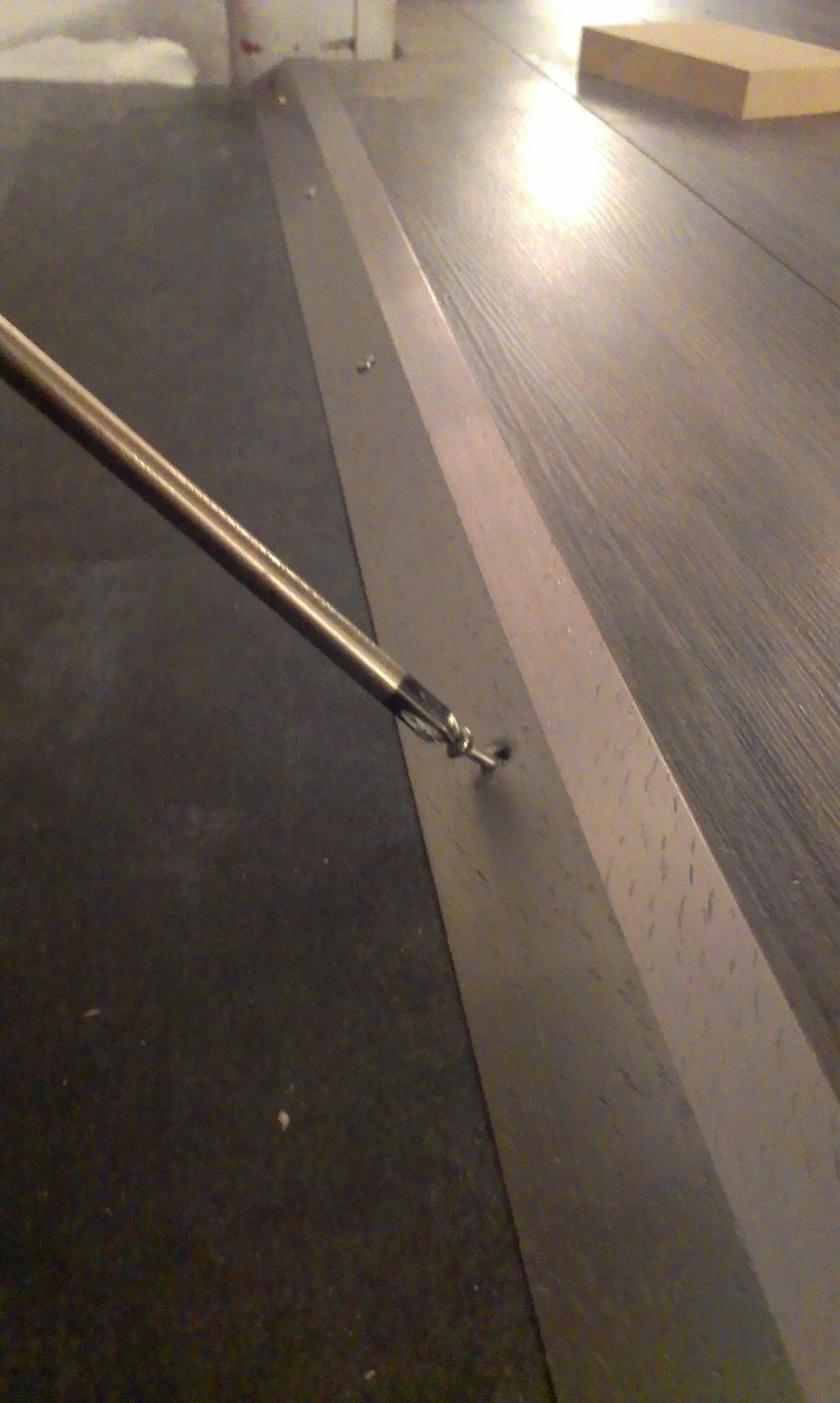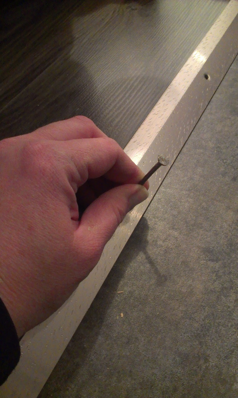 I lined the strip up so that when I drove the screws in, I still left some expansion room for the floor.  I started out just trying to push the screws in with my screwdriver as I turned them.  Not ideal.  The screw kept slipping on the vinyl tile underneath and would end up pinching my fingers.  Hard.