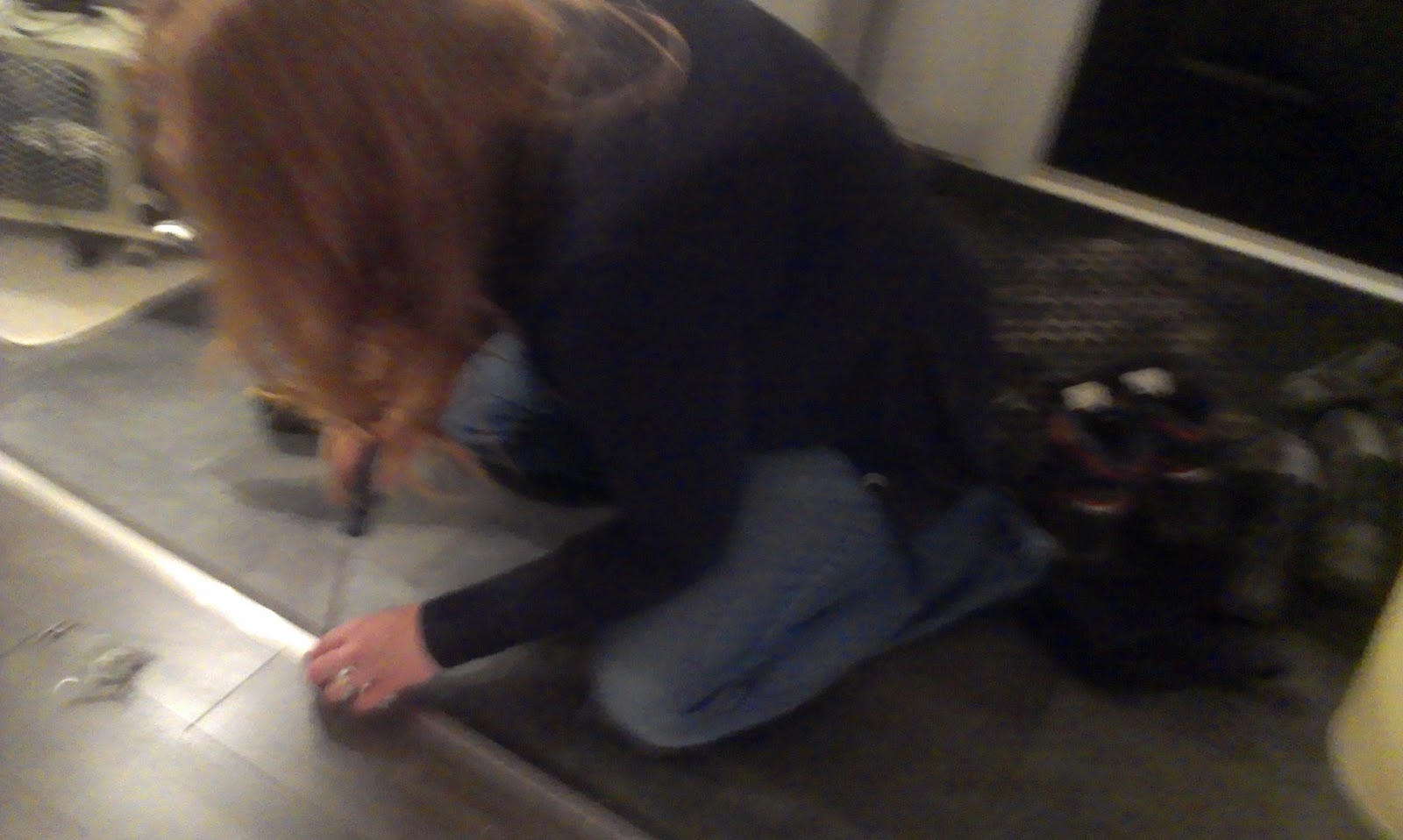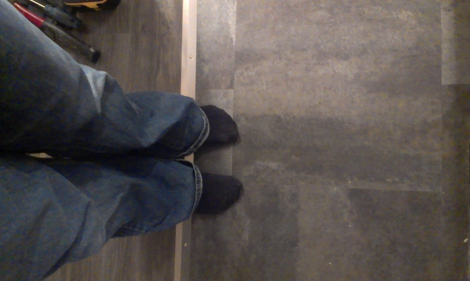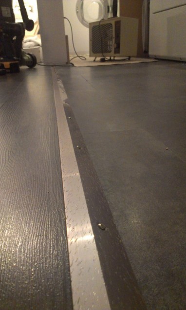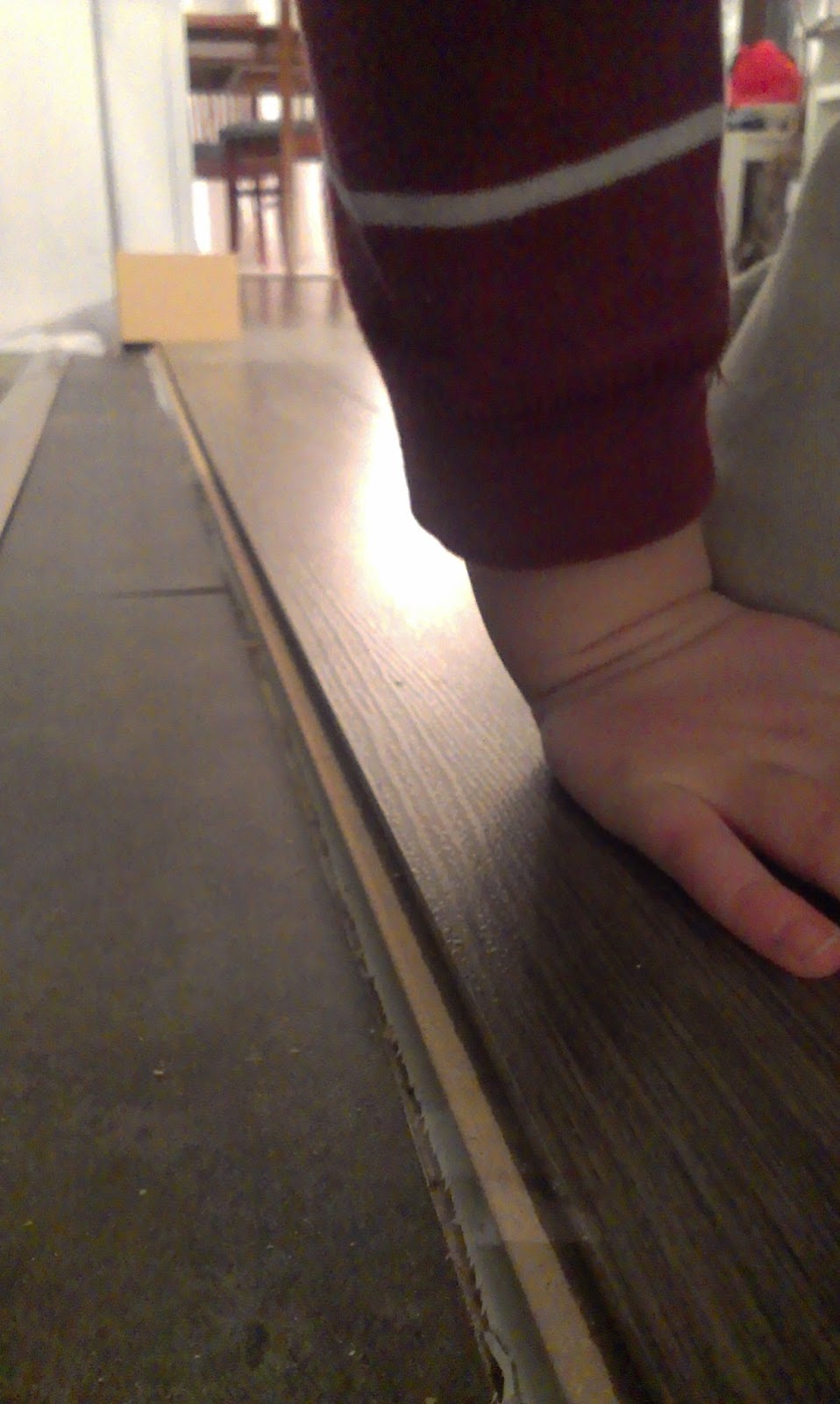 I was getting tired of tripping over that little edge of the flooring.  It’s hard to tell, but it was about 3/8ths of an inch higher on one side.  Oh, and see that little hand there?