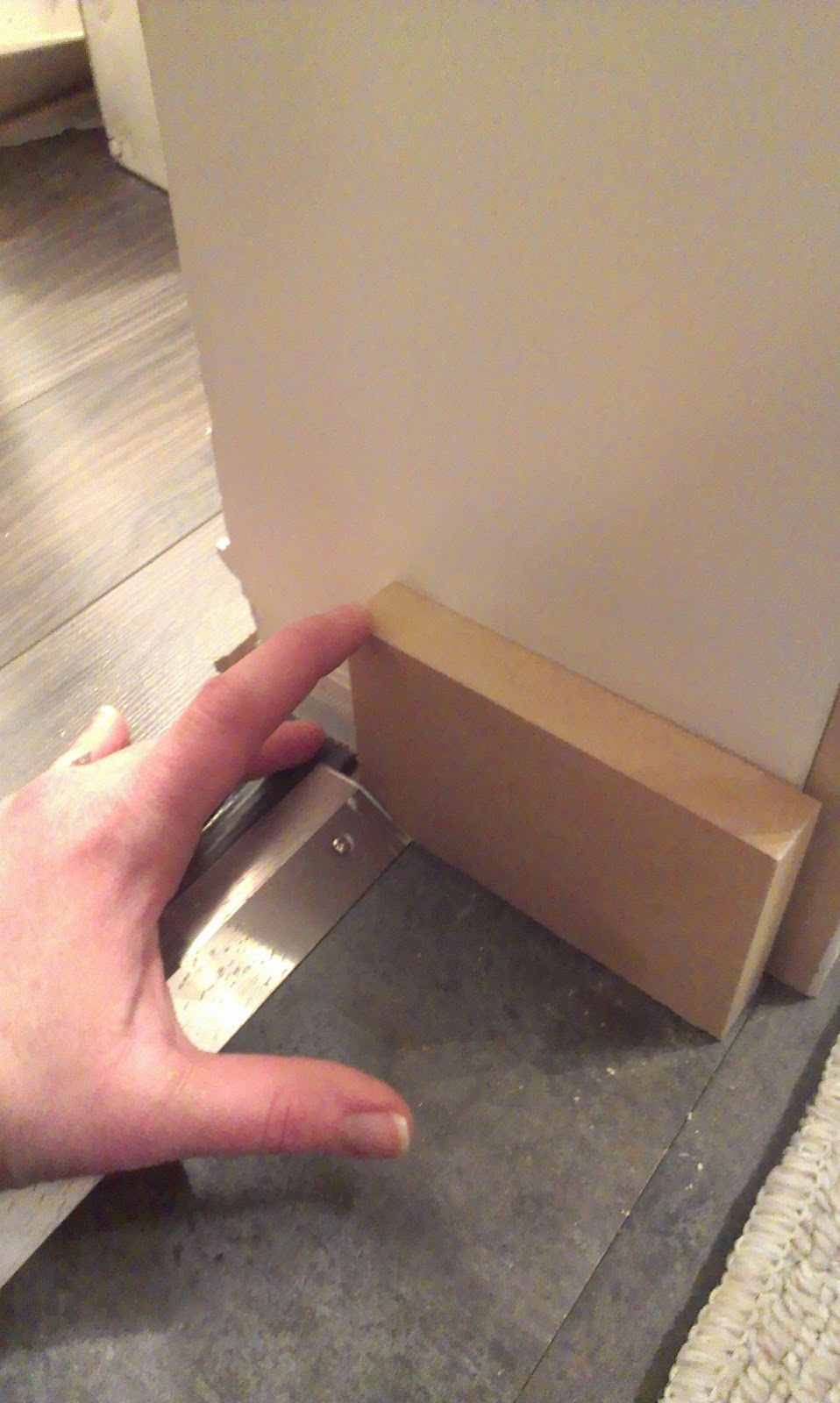 Since I *was* putting it in before the floor trim, I wanted to make sure that I left room on each side for the baseboards.  I just used a spacer block the same thickness as my floor trim to keep things on the up and up.