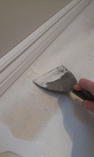 Why several types?  Because I had an assortment available to me and I was just runnin’ through ’em.  I started with wood filler, moved on to a larger gap filler (keep your mind out of the gutter), then finished up with a plain old spackle compound.  My goal wasn’t to do a perfectbeautifulawesome job.  It was to cover the damn floor because guess what?  It sucks getting splinters in the middle of the night.  For realz.