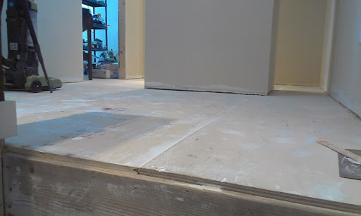 Once the flooring was down, I put down an equalizer strip and then it was time to bang out the laundry counter.  Surprisingly, I took almost no pictures of this process.  I think I just got into a zone and got to work.