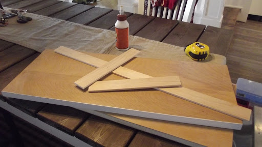 Then, I found a few cabinet doors from the demolition phase of the kitchen and asked John, very nicely, if he would rip them down to a shelf-ish dimension of about 26″x10″.
